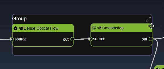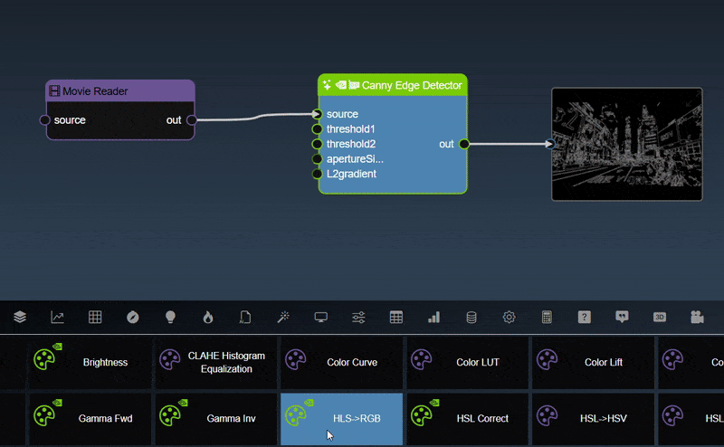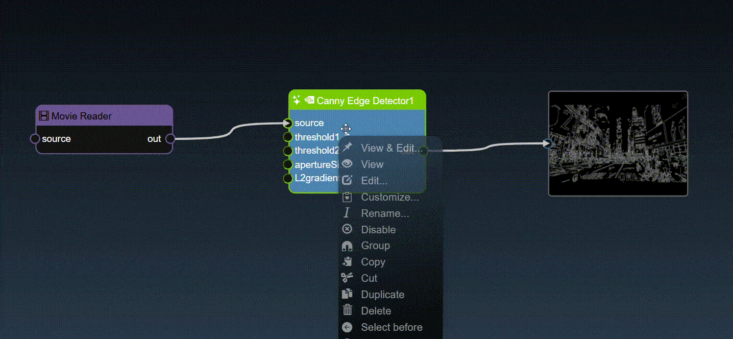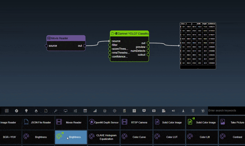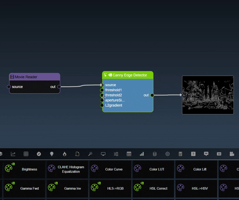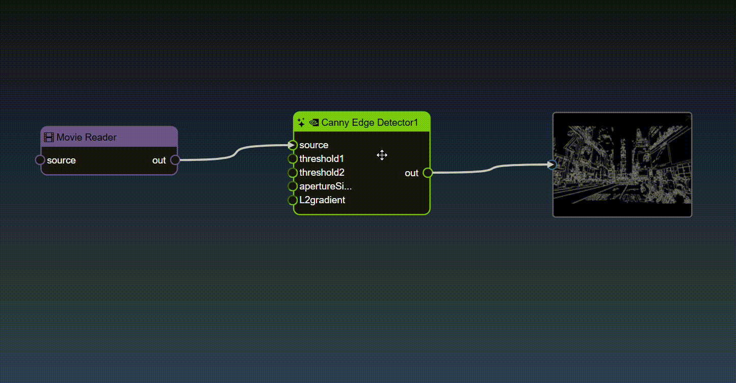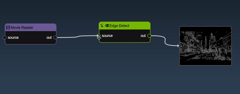 Adding an Edge to connect the output of an upstream node to the input of a downstream node. In this example, we want to have the Yolo Classification be done on a Movie Reader, we thus connect the output of the Movie Reader node to the input of the Yolo Classification node. Click on the source port of the upstream node and the drag to the destination port of the downstream node. A green line color indicates that the edge is allowed which is based on the type matching between the two ports